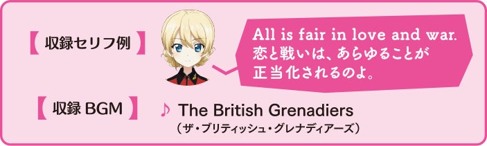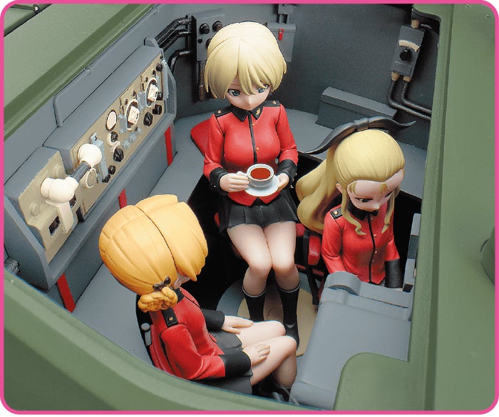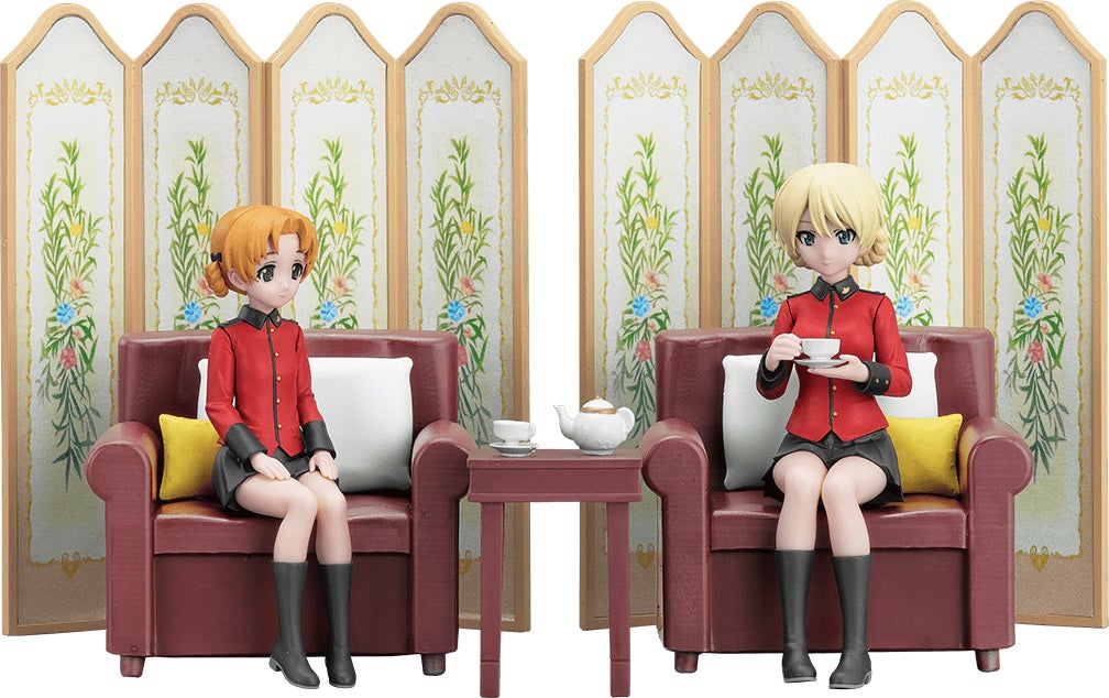 戦場でも優雅に紅茶を嗜むダージリンとオレンジペコ。忠実に再現した衝立、ソファ、クッション、テーブル、ティーセットをセッティングすれば、ふたりの観戦シーンが目の前に。また音声ギミックのなかには大洗vsサンダース、大洗vs黒森峰でのダージリンの格言を搭載しているため、アニメのシーンが再現可能です。