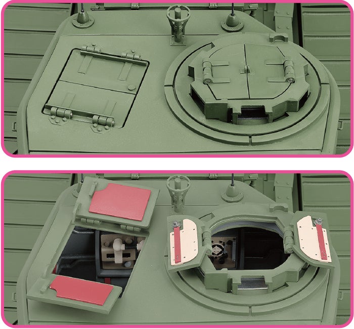 上部カバーを取り外した状態。車長・砲手・装塡手の座席配置や床面、側面のディテールまで緻密に造形。操作感や視界の関係性が伝わるつくり込みを施しています。