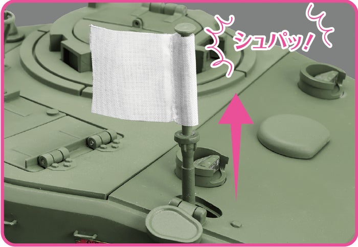 『ガルパン』の戦車ならではの特徴である、撃破された際や競技続行不能と判定された際に揚がる白旗のギミックを徹底再現しました。撃破音とともに白旗が「シュパッ!」とひるがえります。