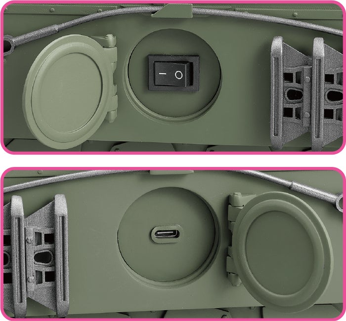 チャーチルならではの車体側面の丸型ハッチを開けると、電源スイッチと内部バッテリーを充電するためのType-Cポートが搭載されています。
