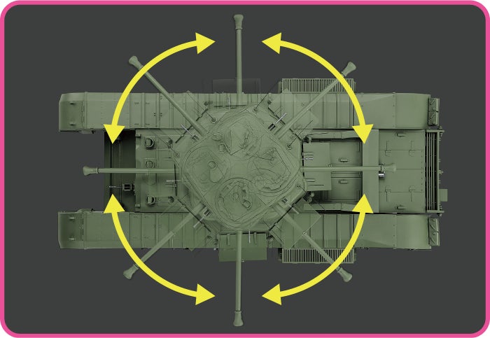 前進・後退・左右転回はもちろん、超信地旋回(スピンターン)も可能。左右の履帯と砲塔は、それぞれ独立してコントロールすることができます。