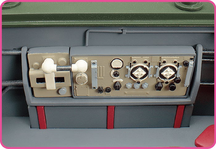 校章が描かれた特製リモコンでチャーチルMk.Ⅶを思いどおりに動かすことができ、さらにキャラクターボイスや楽曲、エンジンの走行音、砲撃音の再生も可能。リモコン本体もキット付属のパーツで組み立てていきます。