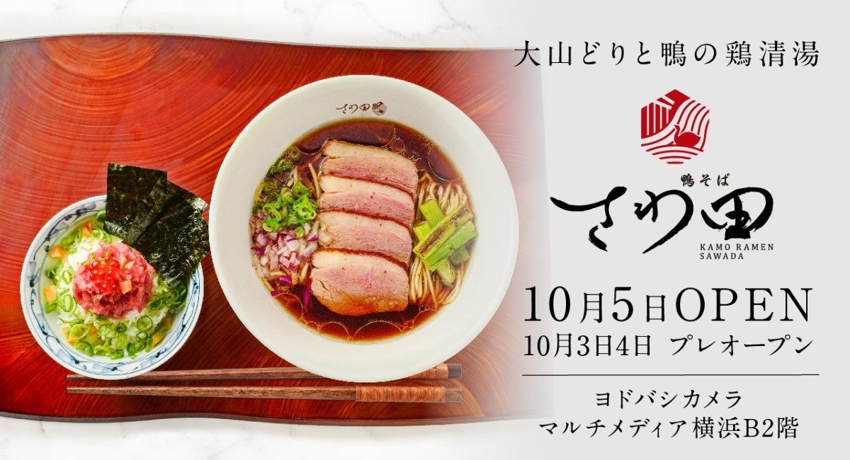 株式会社ファイブグループ(東京都武蔵野市:代表取締役社長 坂本憲史)の関連会社である、株式会社牛かつ もと村(東京都武蔵野市:代表取締役社長 坂本憲史)は2022年10月5日(水)、ヨドバシカメラ マルチメディア横浜内に、らーめん専門店『鴨そば さわ田』をオープンいたします。昨年東京・吉祥寺にオープンした『らぁ麺 さわ田』の系列店にあたり、同店と同じ高級食材を贅沢に使ったスープで、清流のように澄んだ味わいと旨味をお届けします。また今回の新店では「らーめん」に合うミニ丼を3種類ご用意。日本ならではの味わいにこだわった極上スープとミニ丼の新感覚ペアリングをお楽しみいただけます。