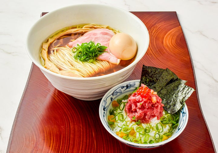 鴨だしの清鶏湯と風味豊かな醤油、鶏油には、魚屋三代目のたたきまぐろミニ丼、魚屋三代目のたたきサーモンミニ丼がおすすめです。