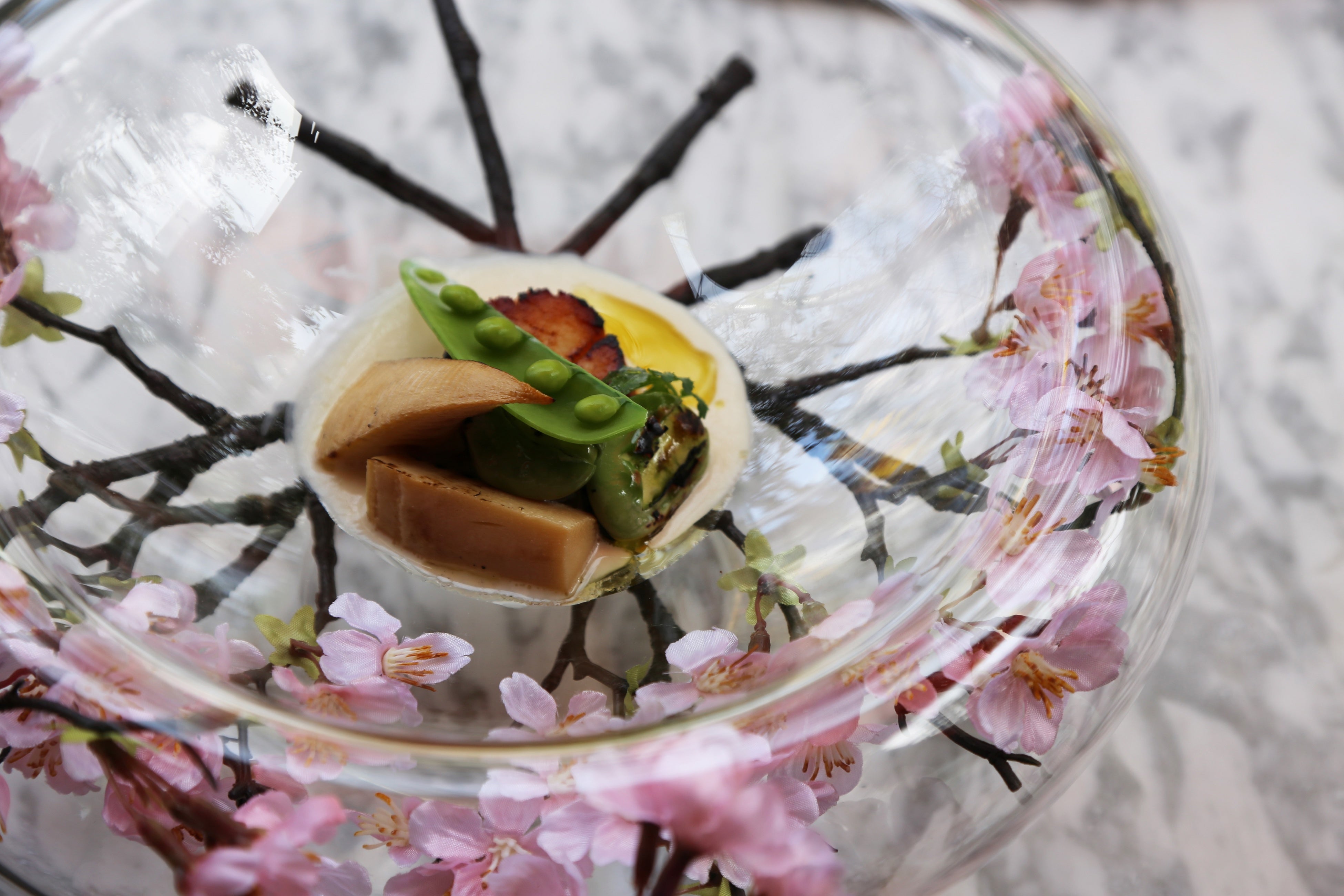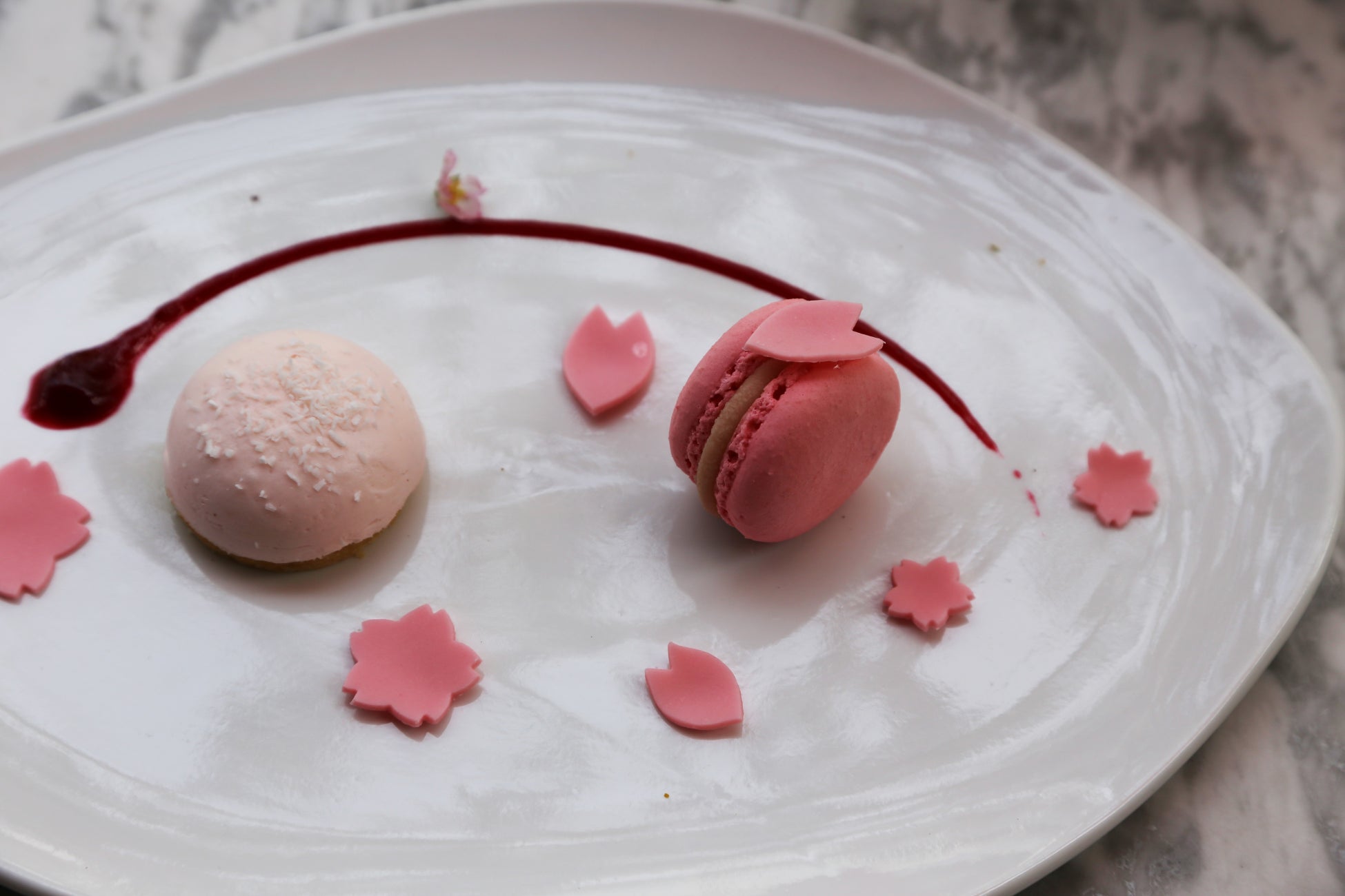 この時期限定で登場するのは、様々な春食材を使用したランチとディナーのコース。全4品のランチコースは、甘みのある新玉ねぎのソースを添えたホタテのソテー、春野菜の代表格であるホワイトアスパラと春野菜のフリット、脂の乗った旬の桜鱒のコンフィ、桜のマカロンと桜のクレームダンジュです。 ディナーコースはランチの4品に、桜海老と菜の花の焼きリゾットと黒毛和牛のタリアータが加わります。