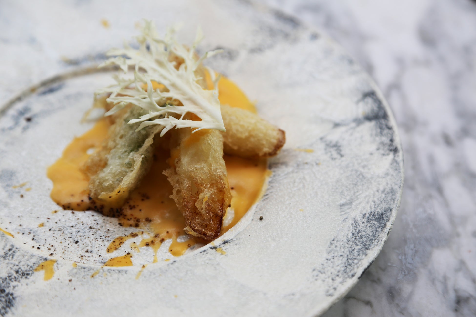 桜鱒のコンフィ ホワイトアスパラと春野菜のフリット/前菜