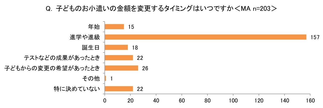 また、「子どものお小遣いの金額を変更するタイミングはいつですか<MA>」では、約8割が「進学や進級」(157)のタイミングと回答し、最も多い結果となりました。進学、進級などの節目に合わせて、お小遣いの金額も定期的に見直されていることが分かります。