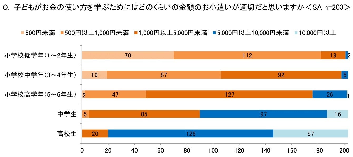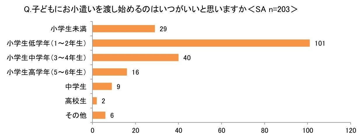 「子どもにお小遣いを渡し始めるのはいつがいいと思いますか<SA>」という問に、半数が「小学生低学年(1~2年生)」と回答しました。また、「小学生未満」(14%)、「小学生中学年(3~4年生)」(20%)をあわせると8割以上にのぼり、多くの家庭で、小学4年生までにはお小遣いを渡し始めていることが分かります。