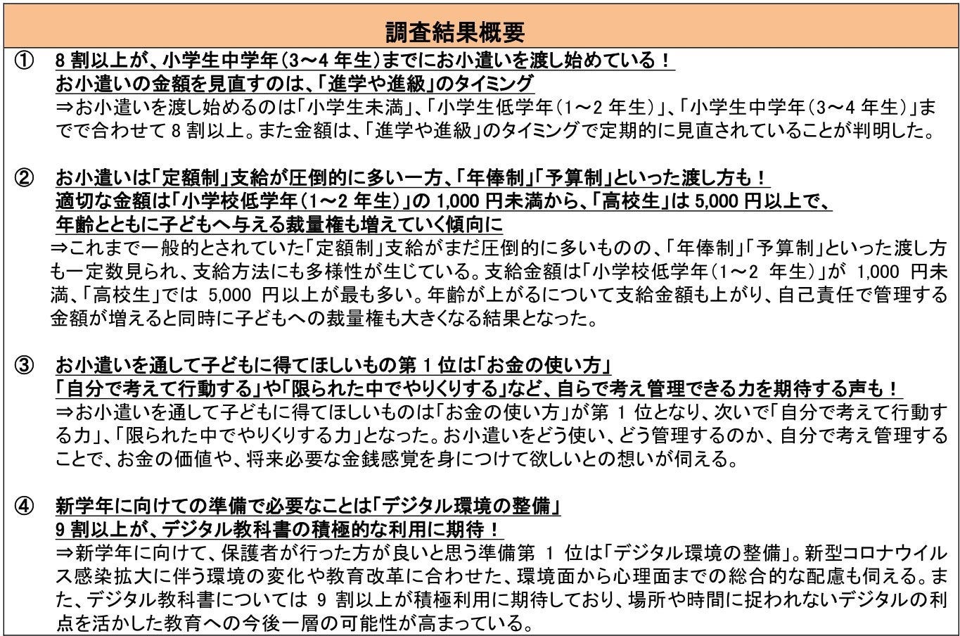 今回、イー・ラーニング研究所では20代~50代の子どものいる親を対象に「2022年:お小遣い並びに新学年に向けての調査」を実施いたしました。その結果、お小遣いの渡し始めの時期や金額変更のタイミング、またその支給方法にも多様化が進んでいることが分かりました。さらに、お小遣いを通して自分で考え管理する能力や、将来必要な金銭感覚を身につけて欲しいとの想いが伺えます。また、保護者は、新学年に向けて、環境整備や心理的なサポートの必要性を感じ、併せて今後のデジタル教育の広がりにも期待していることが見てとれます。