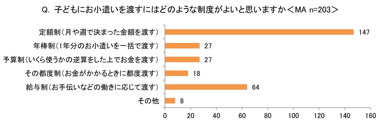 「子どもにお小遣いを渡すにはどのような制度がよいと思いますか<MA>」という問では、7割以上が「定額制(月や週で決まった金額を渡す)」(147)と答え、最も多くなりました。一方で、近年注目が高まりつつある「年俸制」や「予算制」といった方法でお小遣いを渡している家庭も一定数いることが分かりました。近年加速するキャッシュレス決済の普及や金融教育の導入などによって、お金を取り巻く環境が変わり学ばなくてはならないことも増え、家庭での金融教育においてもさまざまな選択肢が出てきていることが伺えます。