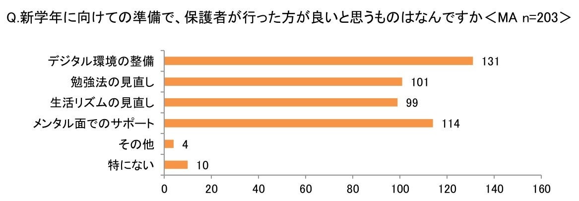 「新学年に向けての準備で、保護者が行った方が良いと思うものはなんですか<MA>」という問では、「デジタル環境の整備」(131)が最も多い結果となりました。新型コロナウイルス感染拡大に伴い、教育現場でのIT化が急速に進み、オンライン授業もニューノーマルとなった今、場所を選ばず学習できる環境を整備することが重要だといえます。続いて多い「メンタル面でのサポート」(114)、「勉強法の見直し」(101)についても、コロナ禍以降、これまでの生活スタイルや環境が急激に変わったことで、子育てや教育におけるサポートが必要になっていることが伺えます。特に、子どもの戸惑いや不安に対してのサポート、オンライン教育や教育改革での新教科への対応など、環境から心理的な面まで総合的に配慮していることが分かる結果となりました。