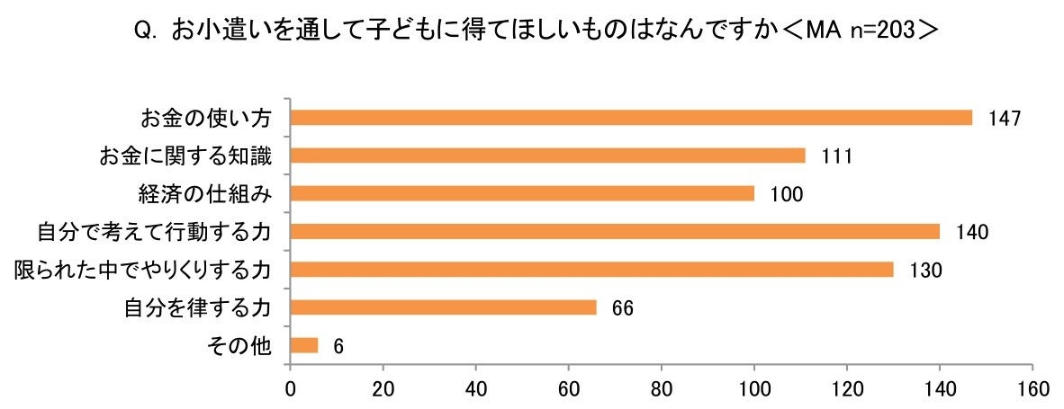 「お小遣いを通して子どもに得てほしいものはなんですか<MA>」という問いで最も多い回答は、「お金の使い方」(147)となりました。消費する、貯金するなどのお金の使い方を、お小遣いを通して幼少期のうちから学び、必要なものを見極める力をつけて欲しいと望んでいることが分かります。また、次いで「自分で考えて行動する力」(140)、「限られた中でやりくりする力」(130)が続きました。限られた範囲内で、使う時期や使い方を自分で考え管理できるよう、お金の価値や将来必要な金銭感覚を身につけて欲しいと思っていることが明らかになりました。