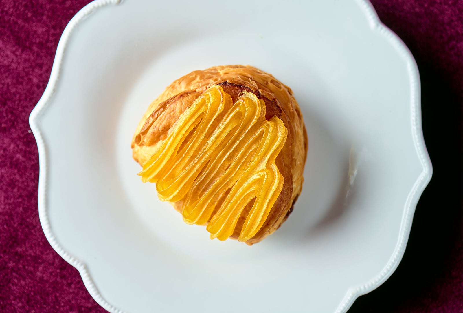 甘いお芋と程よい酸味のりんごをあわせたフィリング、トロっとしたカスタードクリームをぎっしり詰め込んだ、秋限定のフレーバーパイ。今年もしっかりとした甘味の“紅はるか”を使用し、昨年からの変化としてパイの表面にカラメルソースのアクセントを加えました。フィリングに入る“紅はるか”は、お芋本来の美味しさをご堪能いただけるよう、ねっとりとしたペーストとゴロゴロとしたダイスカットの蜜漬けを使用。シャキシャキ食感の厳選りんごが合わさることで、3つの異なる食感をフィリングでお楽しみいただけます。トッピングにはカラメルソースと黒ゴマをあしらい、どこか懐かしく香ばしい風味をご堪能いただけます。