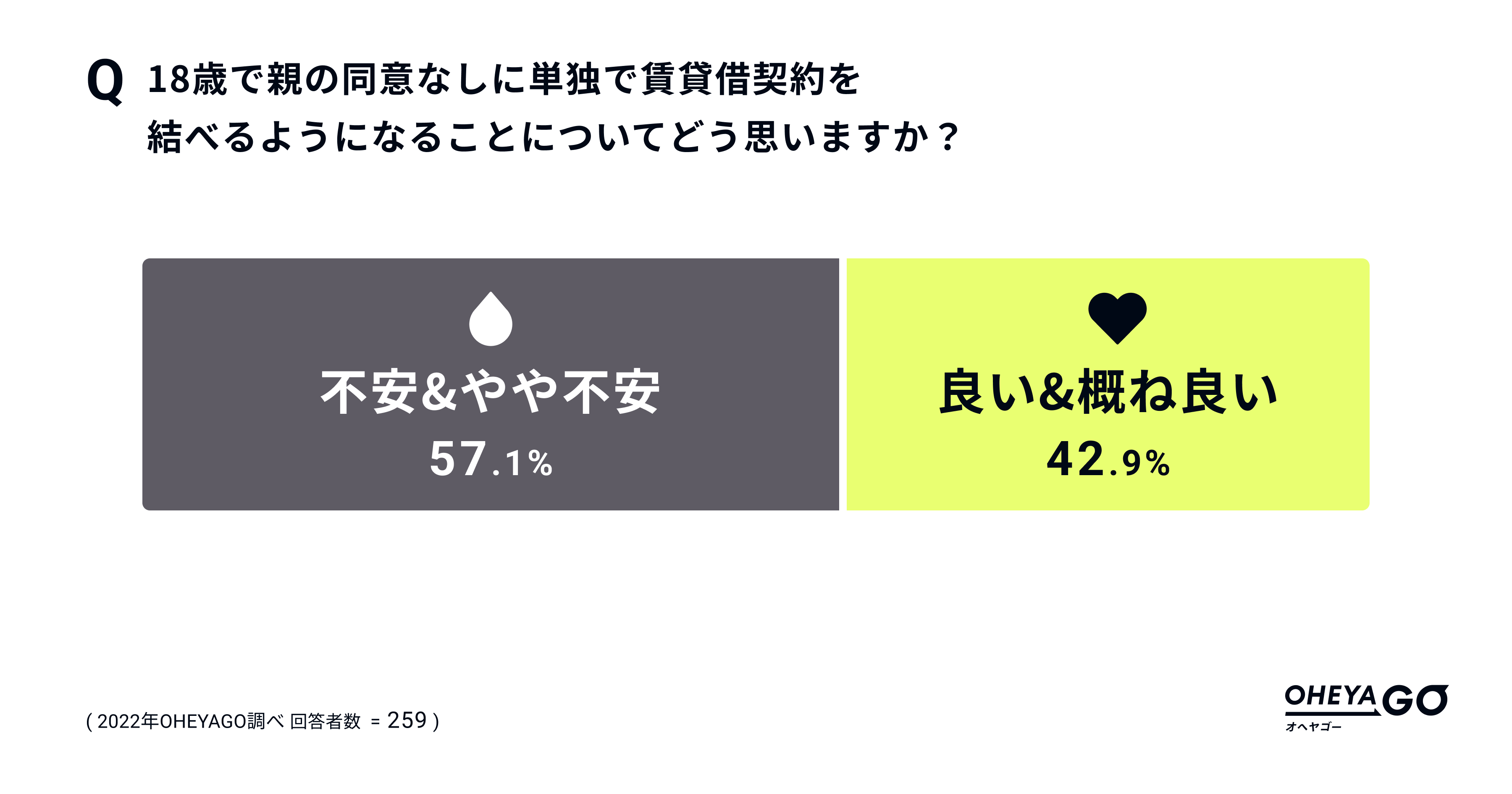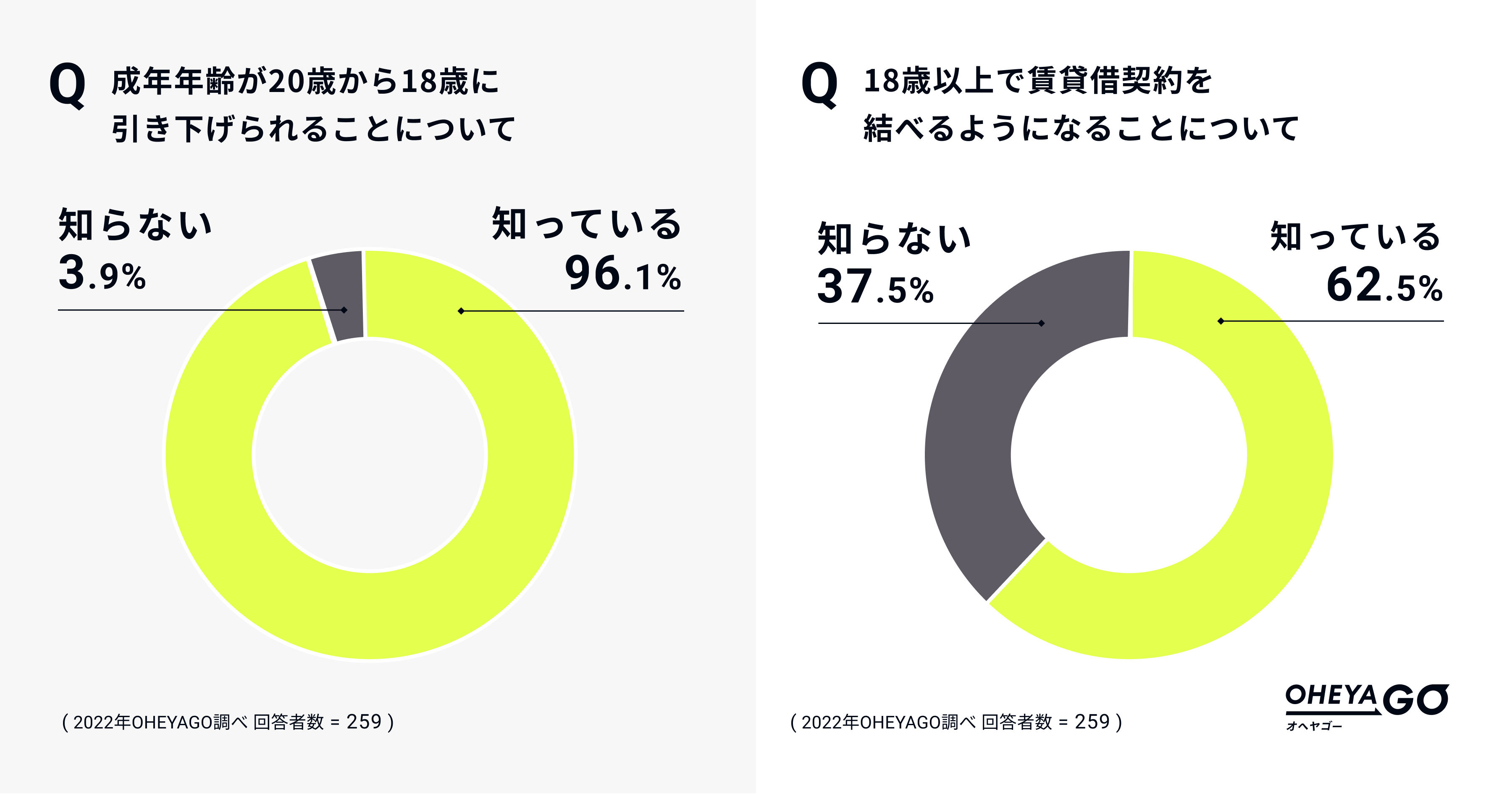 テクノロジーで不動産の賃貸取引をなめらかにするイタンジ株式会社が提供する、スマートフォン上でお部屋探し、内見予約、入居申し込みまでが完結する、セルフ内見型賃貸サイト「OHEYAGO(オヘヤゴー)」( https://oheyago.jp/ )は、民法改正(※1)による成年年齢引き下げを背景に、Twitterアカウントのフォロワー259人に対し実施した、賃貸と成年年齢引き下げに関する意識調査の結果を発表します。