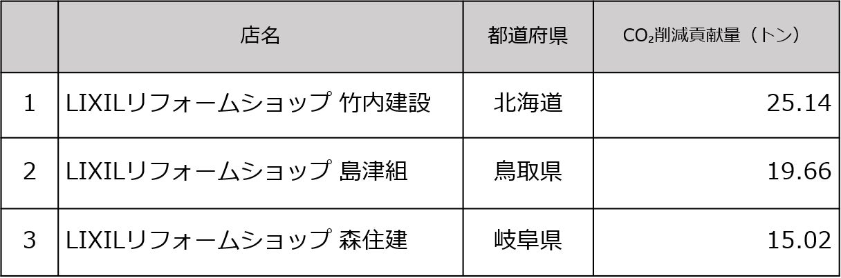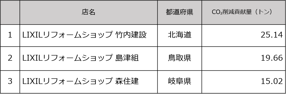 2021年度は、LIXILリフォームショップ 竹内建設さま(北海道札幌市)が25.14トンのCO2削減に貢献し、総合部門にて1位を獲得しました。エリアごとでの平均CO2削減貢献量で評価する団体部門では、北海道が平均3.49トンで1位を獲得しました。2021年度は合計599トンのCO₂削減に貢献しましたが、今後もこの活動を継続していき2023年度までの3年間合計で4,016トンの削減を目指していきます。