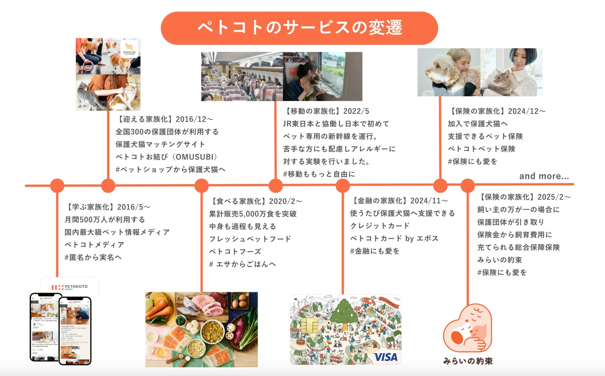 2022年5月にはJR東日本と提携し日本初のペット専用新幹線の運行、2024年11月には丸井と提携し使うだけで保護犬猫に支援できるクレジットカード「ペトコトカード」、12月にはT&D保険グループのペット&ファミリー損害保険株式会社と提携し加入するだけで保護犬猫に支援できるペット保険「ペトコトペット保険」、25年2月にはリトルファミリー少額短期保険株式会社と提携し飼い主さまの“もしも”のときに愛犬・愛猫の未来を守る保険「みらいの約束」の販売を開始しました。