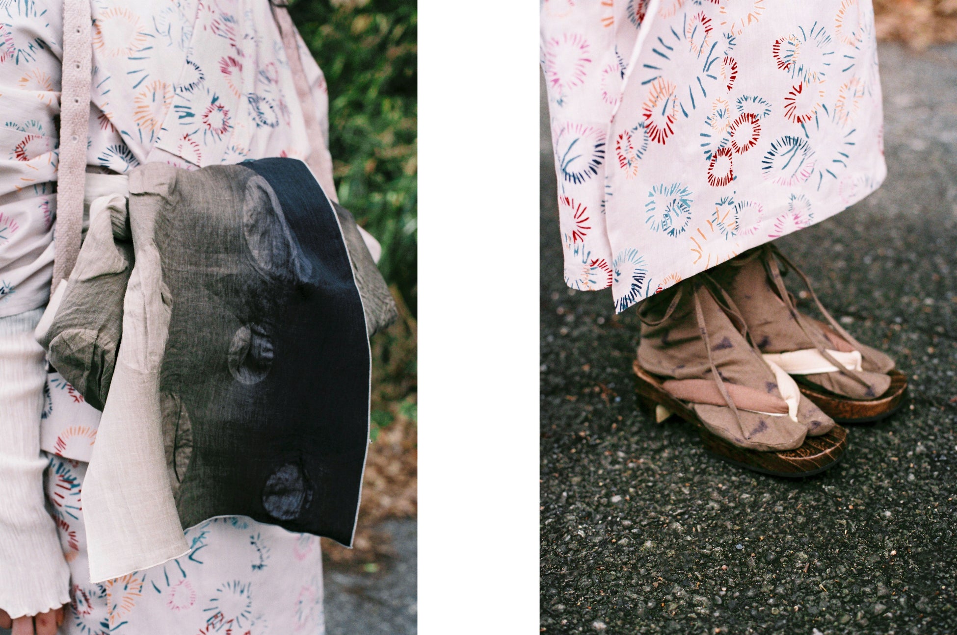 鼻緒部分には墨流しの片貝木綿の生地を使用し、一足一足異なる表情が魅力で、足元を見るだけで心踊るようなデザインを目指しました。台には、ソファーなどに用いられるPVC加工を施した合皮を採用し、丈夫で汚れにくい仕様です。また表面の凹凸感により、ベタつきによる夏の蒸れを軽減します。