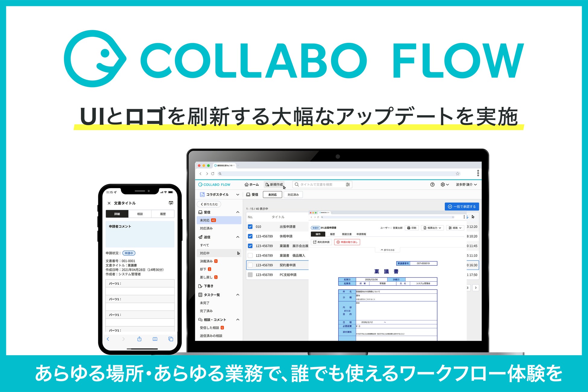「ワークスタイルの未来を切り拓く」を理念に掲げる株式会社コラボスタイル(所在地:愛知県名古屋市、代表取締役社長 兼 CEO:松本 洋介、以下 コラボスタイル)は、クラウドワークフローシステム「コラボフロー」において、UIの大幅なアップデート、プロダクトロゴの変更を実施したことをお知らせいたします。