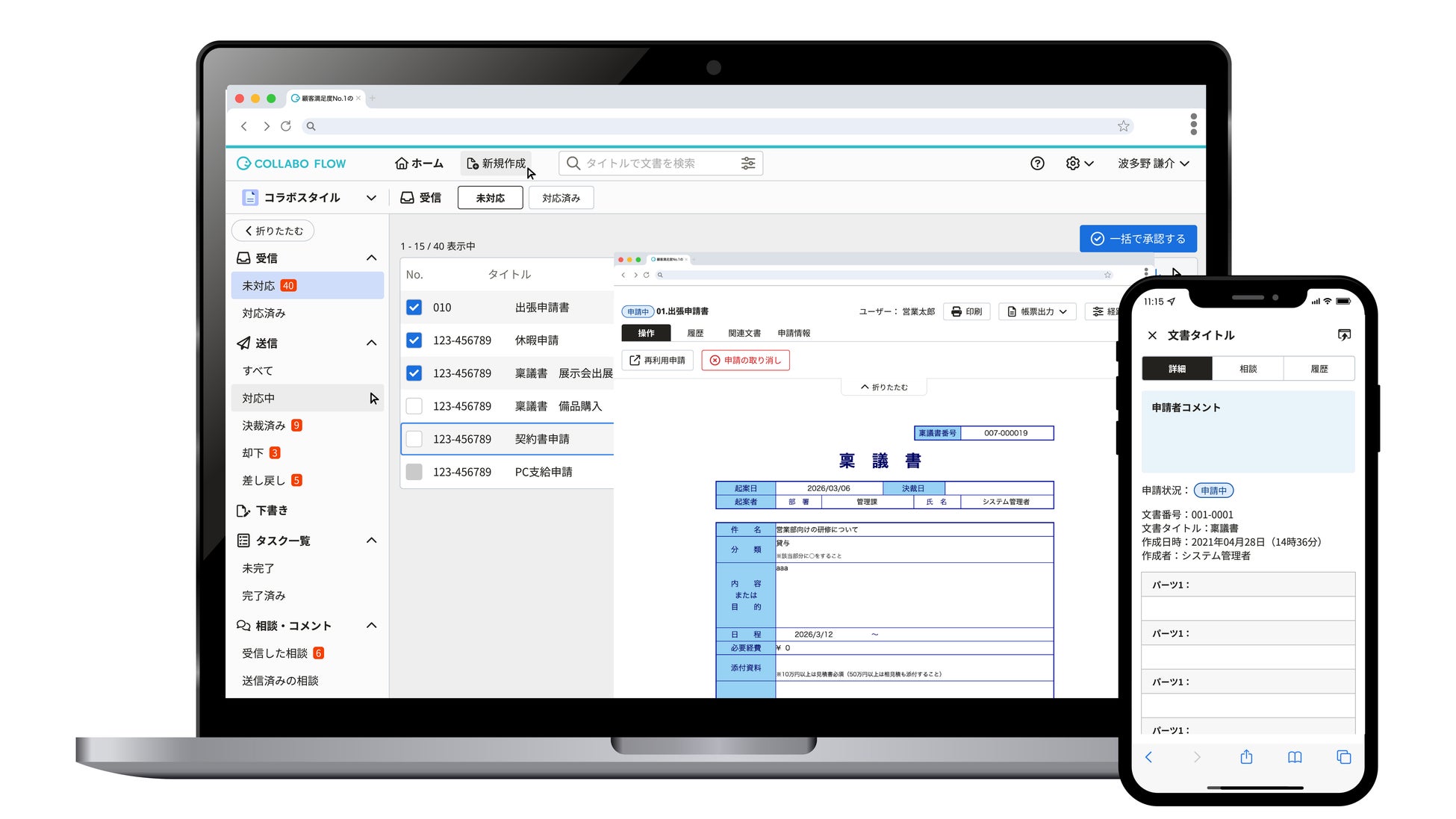 Webが使える方なら誰でも簡単に作れて修正できる、直感的な操作性を持つワークフローシステムです。コラボフローを使えば、パソコンに専用のソフトをインストールする必要なく、Webブラウザーを使って稟議書などの社内申請業務を効率化できます。タブレットやスマホでも利用でき、自宅や出先でも申請・承認を行えます。申請書一つから、また少人数から数千名規模での導入も可能です。
