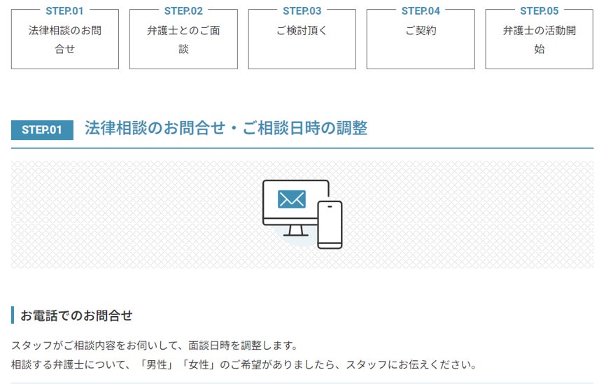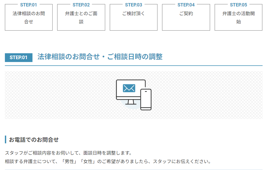 「相談したらすぐに契約になってしまうのではないか」「問合せをする前に、解決までの流れを知りたい」というお声もいただいていたことから、「ご相談から解決までの流れ」のページも改修しました。ページの最初に一目で全体の流れが把握できるよう、相談から解決までの流れをステップごとに記載。スクロールするにしたがって各ステップごとの詳細を見ることができる形に変更しました。