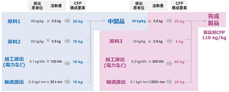 業務コア情報と品目単位量当たりの温室効果ガス排出量(排出原単位)を乗算し、積み上げることでCFPを算出します。自社の活動による排出量(Scope1,2(注4))に加え、製造にかかわる間接的な排出量(Scope3)などを登録することで求めたいスコープでCFPを計算できます。複数の工程を保有する製品においても、親子関係とその活動量・排出係数を定義することで段階的に積み上げ計算することが可能です。また、同一情報を活用することで、新商品開発等におけるCFPシミュレーションへの応用も可能です。