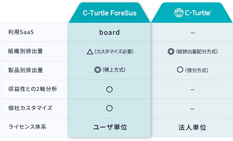 サステナビリティと収益性の両輪で経営管理をめざすというコンセプトのもと、CFPを中心としたサステナビリティ関連情報と製品別の収益情報を同一システム内で管理するソリューションとして提供してきた、「サステナビリティ経営管理基盤」に、以下の新機能を追加し「C-Turtle ForeSus」として新たに提供開始します。