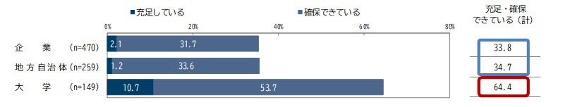 人材の充足・確保状況(「充足している」+「確保できている」の計)では、大学が充足している結果となった。