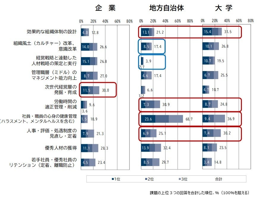 組織・人事領域の課題では、企業、地方自治体、大学での課題感の違いが大きく表れた。