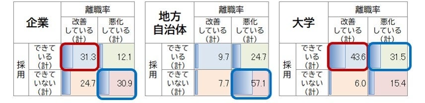 大学は、「採用ができて離職率も改善傾向にある」組織は4割で、最も人材確保状況が安定している結果となったが、「採用はできているが離職率は悪化傾向にある」も3割あることに留意が必要である。