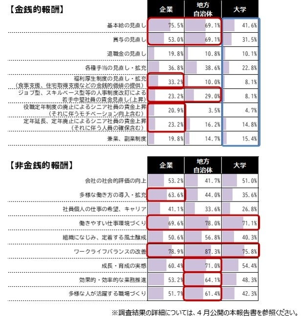 【金銭的報酬】【非金銭的報酬】それぞれで、企業、地方自治体、大学で実施状況のばらつきがみられることも特徴である。これは、過去からの水準、法制度、経営環境の変化が異なることが影響している。