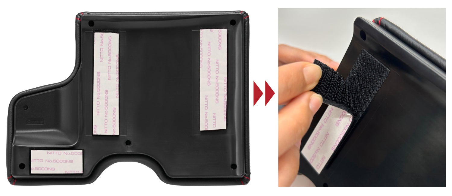 粘着テープ取り付けで、穴あけ加工やネジで固定する作業は不要。アームレストパッド(NZ838)は、面ファスナー付きの粘着テープを採用し、スポーツ走行でシフト操作に支障が出る場合は取り外すことが可能(上画像)