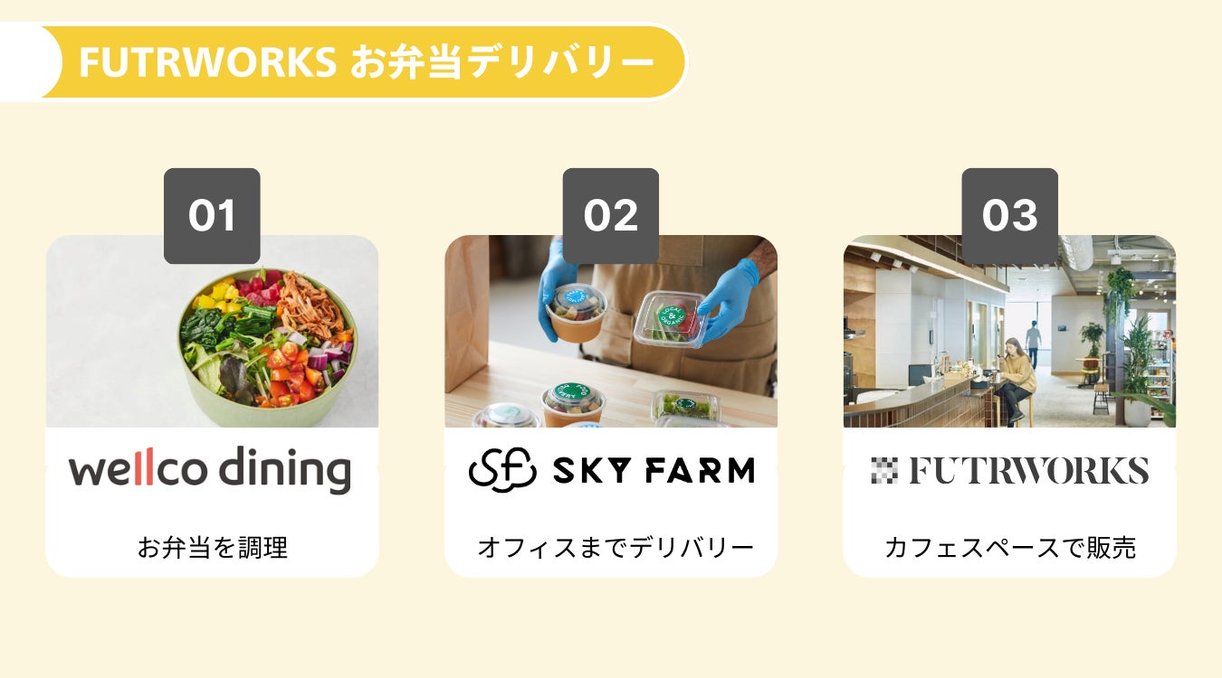 この度の取り組みでは、FUTRWORKS入居者がオフィスの外へ出る必要なく、栄養満点のランチをお召し上がりいただくことを目的に3社でサービスを提供。WELLCO DININGで調理された料理を、当社の専属配送員がデリバリーし、入居者はオフィス内カフェスペースの販売会場にておにぎりやお惣菜をお買い求めいただけます。