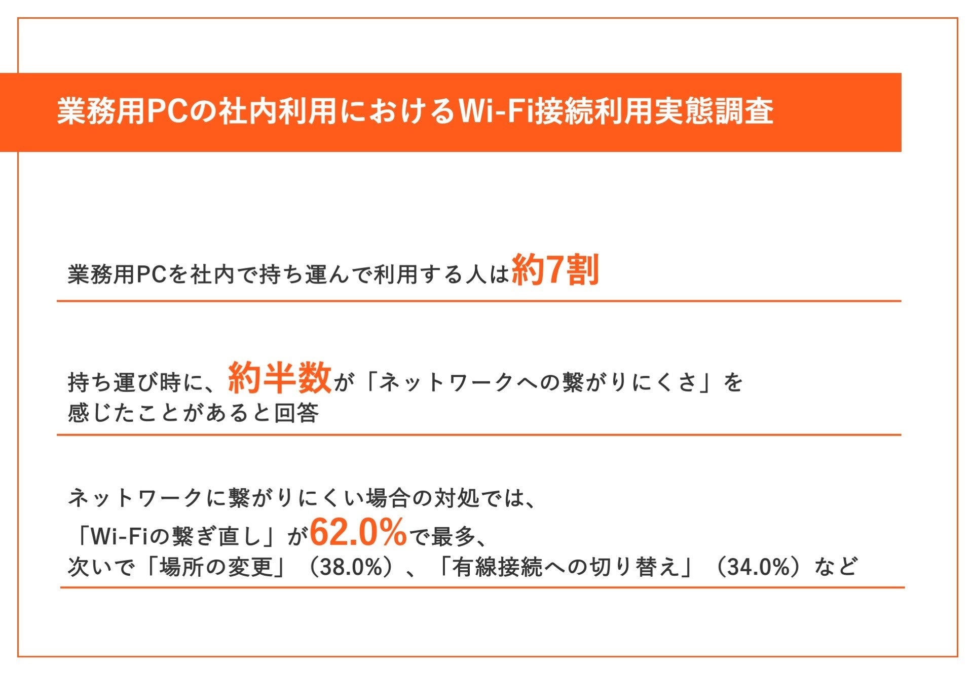 まず、約7割が、社内で業務用PCを「毎日1回以上持ち運ぶ」と回答しており、その場面としては、「会議や打ち合わせ(対面)」(80.6%)、「会議や打ち合わせ(オンライン)」(63.9%)が上位になりました。また、約半数が、「業務用PCを持ち運んで使用する頻度が増えている」と感じており、そのきっかけとして、69.7%が「オンライン会議の増加」を挙げています。一方で、約半数が、業務用PCを持ち運んで使用する際に「ネットワークへの繋がりにくさ」を実感しており、特に「特定の場所や部屋に移動したとき」(64.0%)に繋がりにくさを感じていることが分かりました。ネットワークに繋がりにくい場合の対処としては、「Wi-Fiを繋ぎ直した」が62.0%で最も多く、次いで「場所を変えた」(38.0%)、「有線接続に切り替えた」(34.0%)が挙げられています。