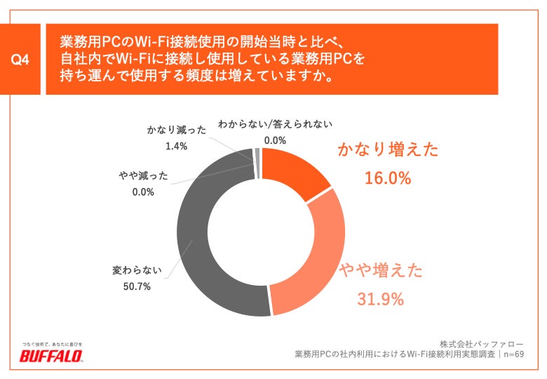 Q1で「1回~2回」「3回~4回」「5回以上」と回答した方に、「Q4.業務用PCのWi-Fi接続使用の開始当時と比べ、自社内でWi-Fiに接続し使用している業務用PCを持ち運んで使用する頻度は増えていますか。」(n=69)と質問したところ、「かなり増えた」が16.0%、「やや増えた」が31.9%という回答となりました。