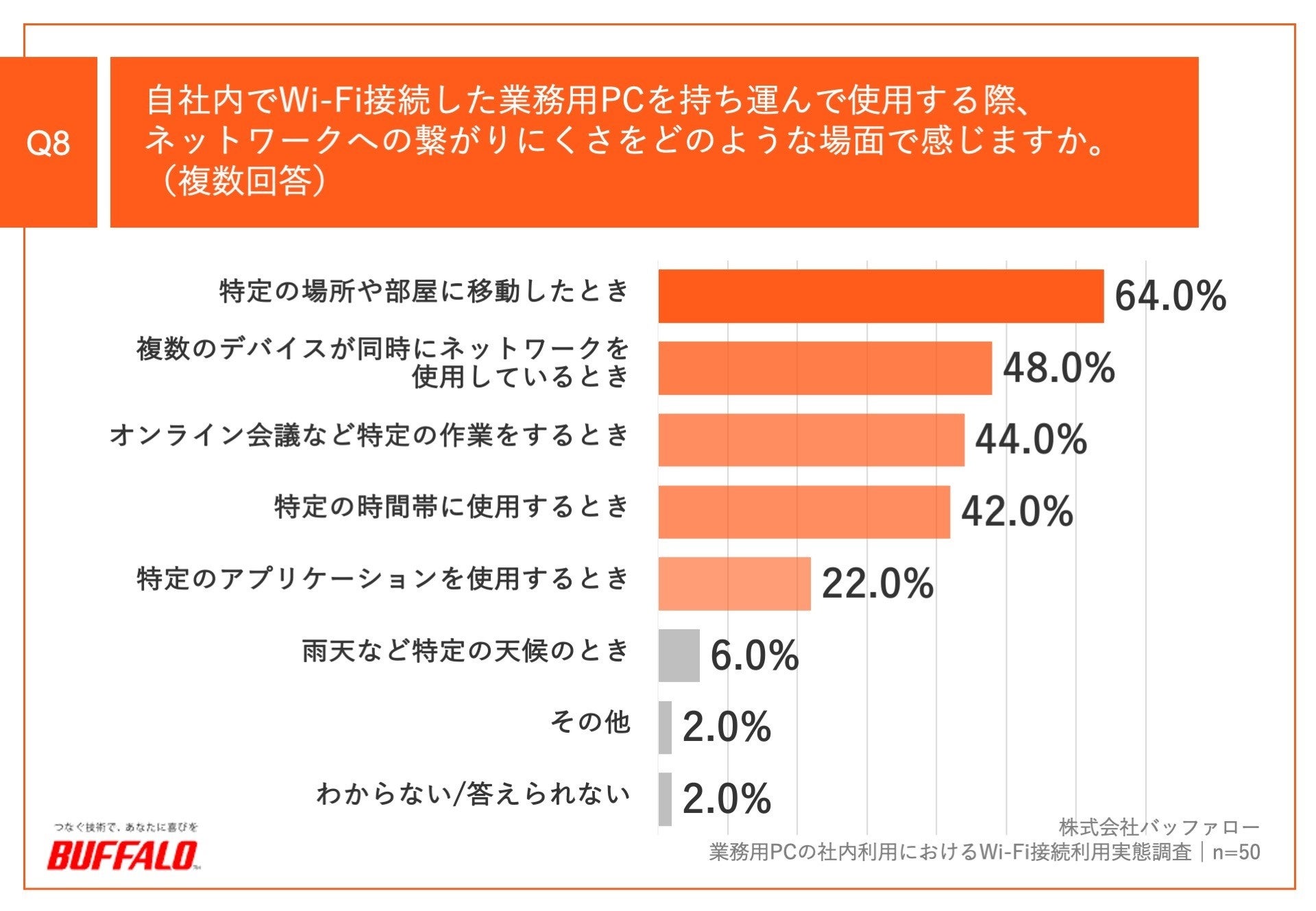Q7で「かなりある」「ややある」と回答した方に、「Q8.自社内でWi-Fi接続した業務用PCを持ち運んで使用する際、ネットワークへの繋がりにくさをどのような場面で感じますか。(複数回答)」(n=50)と質問したところ、「特定の場所や部屋に移動したとき」が64.0%、「複数のデバイスが同時にネットワークを使用しているとき」が48.0%、「オンライン会議など特定の作業をするとき」が44.0%という回答となりました。