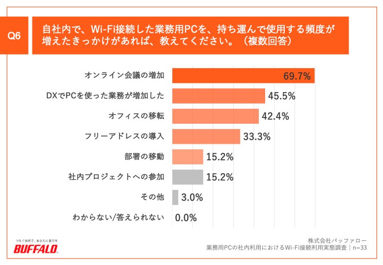 Q4で「かなり増えた」「やや増えた」と回答した方に、「Q6.自社内で、Wi-Fi接続した業務用PCを、持ち運んで使用する頻度が増えたきっかけがあれば、教えてください。(複数回答)」(n=33)と質問したところ、「オンライン会議の増加」が69.7%、「DXでPCを使った業務が増加した」が45.5%、「オフィスの移転」が42.4%という回答となりました。