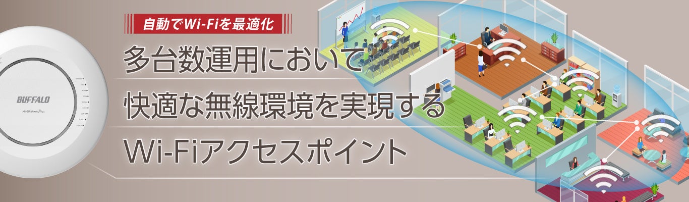バッファローの業務用アクセスポイント「AirStation Pro」は、オフィスなどの広いスペースにおいて多人数でWi-Fiを利用するような、法人のお客様向けに開発されており、手厚いサポート、安定した通信環境の構築、設定管理工数の削減など、ビジネスユースケースに合った無線環境の運用ができます。中でもWi-Fi 6/6E対応のインテリジェントモデルには、最適な電波状況のWi-Fiアクセスポイントへの接続を支援する「ローミング支援機能」やアクセスポイント間の電波干渉を最小化する「AP間電波自動調整機能」といった、多台数の無線環境を快適にする機能が充実。「ローミング支援機能」は、部屋を移動する際にWi-Fiが切り替わらず通信が遅くなる問題を解決します。
