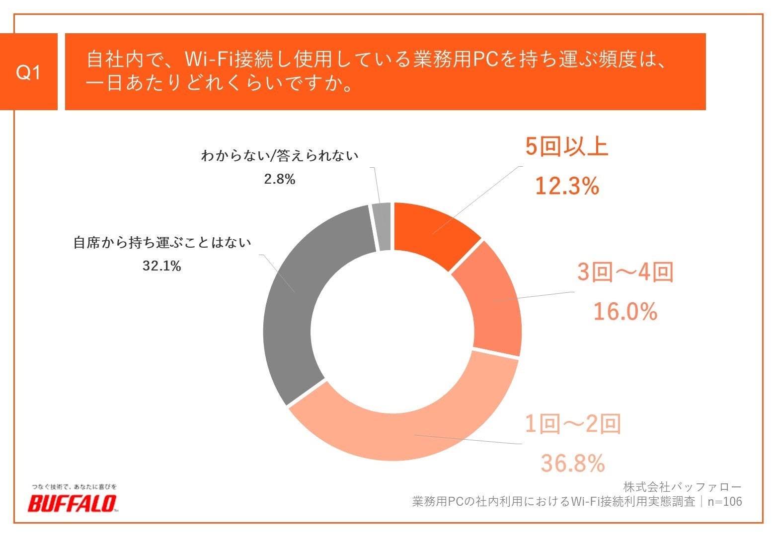 「Q1.自社内で、Wi-Fi接続し使用している業務用PCを持ち運ぶ頻度は、一日あたりどれくらいですか。」(n=106)と質問したところ、「5回以上」が12.3%、「3回~4回」が16.0%、「1回~2回」が36.8%という回答となりました。