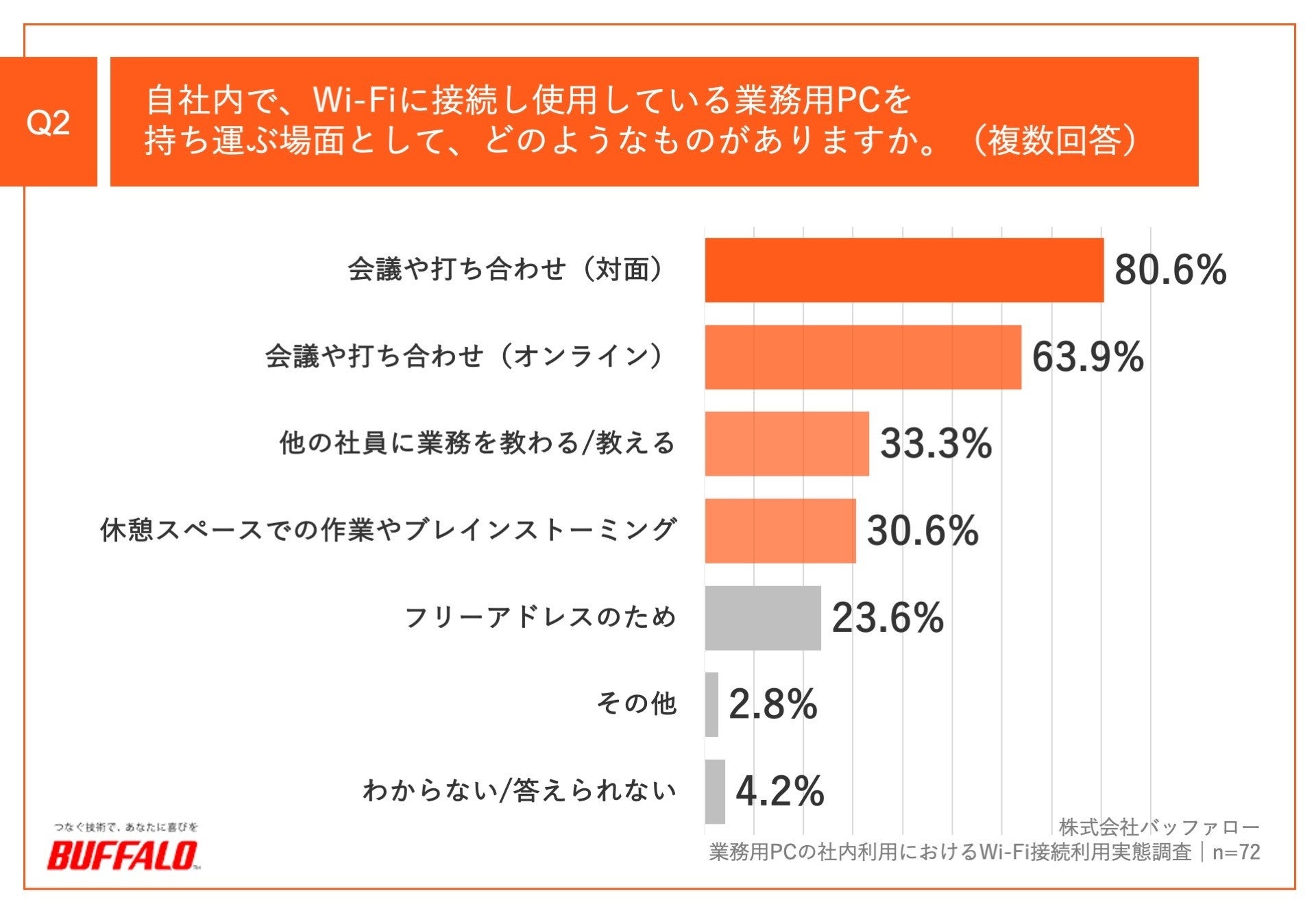Q1で「自席から持ち運ぶことはない」以外を回答した方に、「Q2.自社内で、Wi-Fiに接続し使用している業務用PCを持ち運ぶ場面として、どのようなものがありますか。(複数回答)」(n=72)と質問したところ、「会議や打ち合わせ(対面)」が80.6%、「会議や打ち合わせ(オンライン)」が63.9%、「他の社員に業務を教わる/教える」が33.3%という回答となりました。