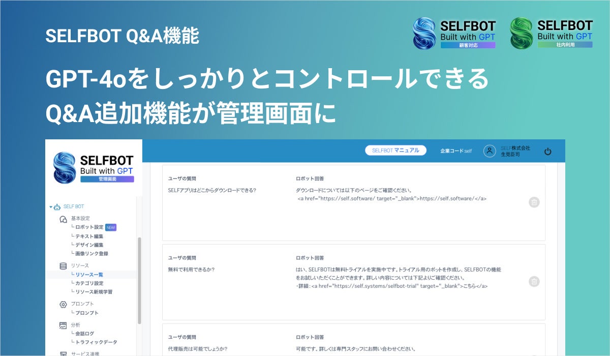 GPT-4o + 回答コントロール機能で、さらに高度な自動応答を実現。SELFBOT(生成AI+RAG連携)