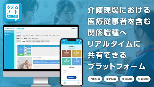 介護施設・在宅における日々の記録(様子・服薬・排泄・バイタル等)を簡便に入力し、医療従事者を含む関係職種へリアルタイムに共有できるプラットフォームです。