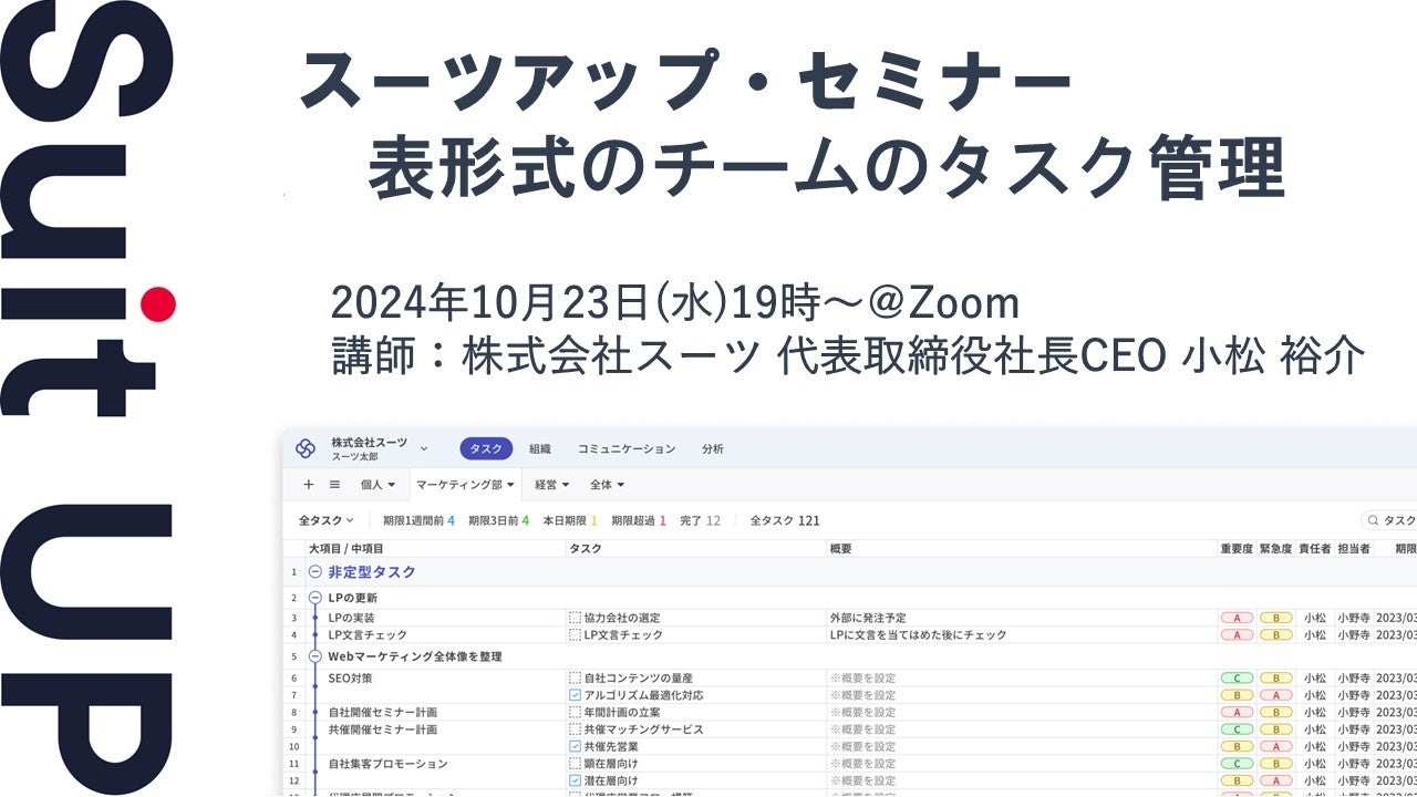株式会社スーツ(所在地:東京都千代田区、代表取締役社長CEO:小松 裕介)は、2024年10月23日(水)19時から、当社代表の小松が講師を務めるスーツアップ・セミナー「表形式のチームのタスク管理」を無料開催します。