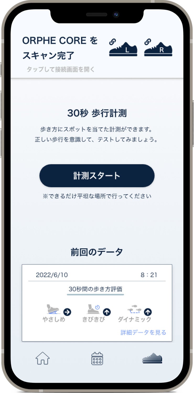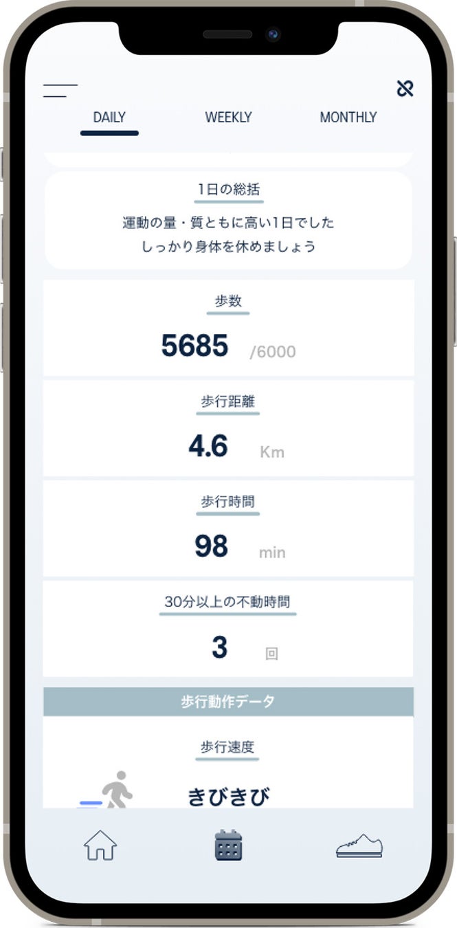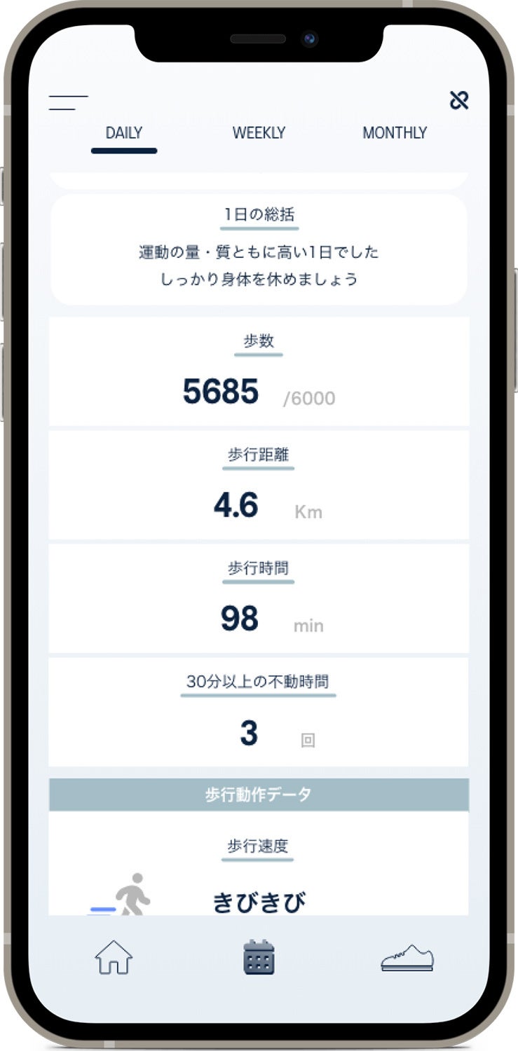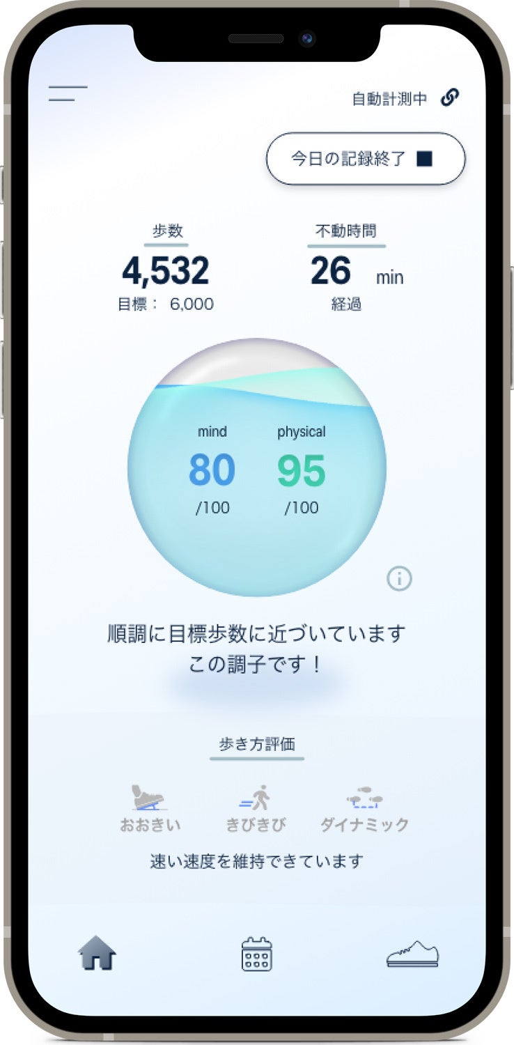 歩数や歩行距離などの量的情報だけでなく、歩行スピードやストライド、接地角度、立脚時間などの質的情報を組み合わせ、パーソナライズされた評価コメントがもらえるほか、頑張りすぎて心と身体のバランスが崩れていないかなど、歩容の分析結果から客観的に自身を見直すことができます。手動計測モードにより、わずか30秒で今の歩容状態を可視化し、すぐに確認ができる点も特徴です。