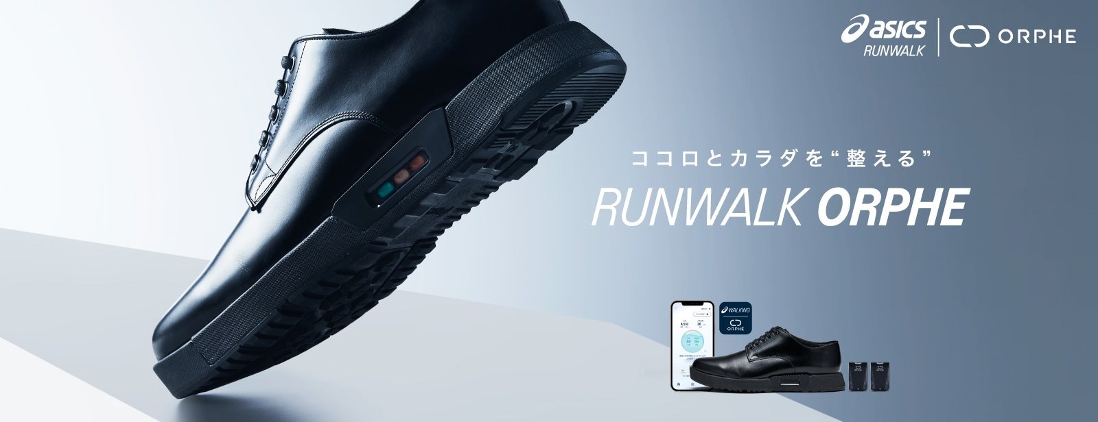 「RUNWALK ORPHE」は、日常生活の中で履いて歩くだけで心身の状態を見える化し、日々のパフォーマンス向上をサポートするビジネスシューズです。ミッドソール(甲被と靴底の間の中間クッション材)の内部に付属のセンサー「ORPHE CORE 3.0(オルフェコア3.0)」を取り付けることで、歩数や歩行スピード、ストライド(歩幅)、接地角度、立脚時間などの歩容(歩行パターン)データを取得し、それらのデータとアシックススポーツ工学研究所が長年培ってきた足と歩き方に関する独自の知見を組み合わせ、心身の状態をスコア化(特許出願中)し、スマートフォンに表示します。