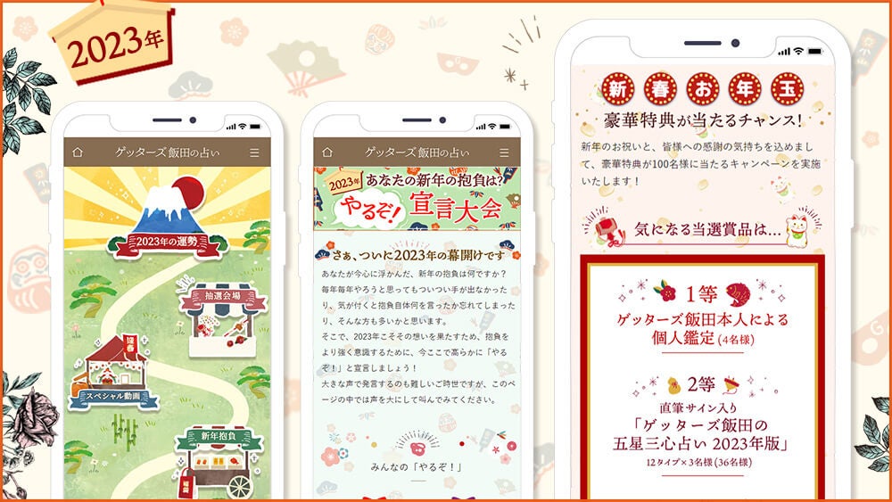 今回リリースした特設ページでは、ゲッターズ飯田さんのオリジナル占術である「五星三心」を使い、全体運から恋愛、結婚、仕事、健康、お金など様々な観点から2023年の運勢を占うことが可能です。加えて2023年運気アップの画像がゲットできるほか、ゲッターズ飯田さんの直接鑑定が抽選で当たるキャンペーンなど、豪華な特典もたくさんございます。ぜひこの機会にお試しください。