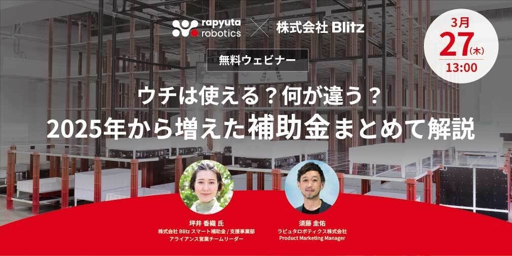 物流向けロボティクスソリューションを提供するラピュタロボティクス株式会社(東京都江東区、代表取締役 CEO:モーハナラージャー・ガジャン、以下、ラピュタロボティクス)は、3月27日(木)に企業の補助金活用コンサルティングを行う株式会社Blitz(東京都渋谷区 代表:伊神 潤、以下、Blitz)との共催で、2025年度の倉庫自動化に活用できる補助金をまとめて解説するウェビナーを実施いたします。