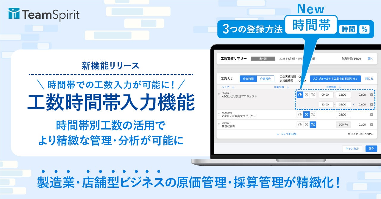 チームスピリット、製造業や店舗型ビジネスの原価管理を精緻化する新機能「工数時間帯入力機能」をリリース