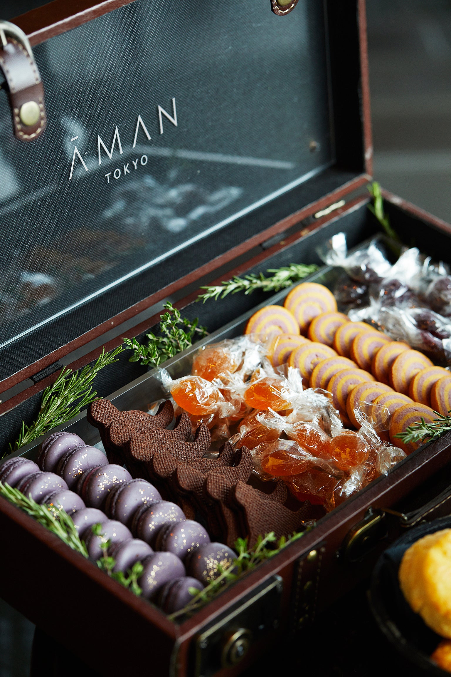 ジュエリーボックス:カシスのマカロン、紫芋とかぼちゃのクッキー、ジャンドゥーヤのクッキー、パッションフルーツのパート ド フリュイ、ブルーベリーのパート ド フリュイ