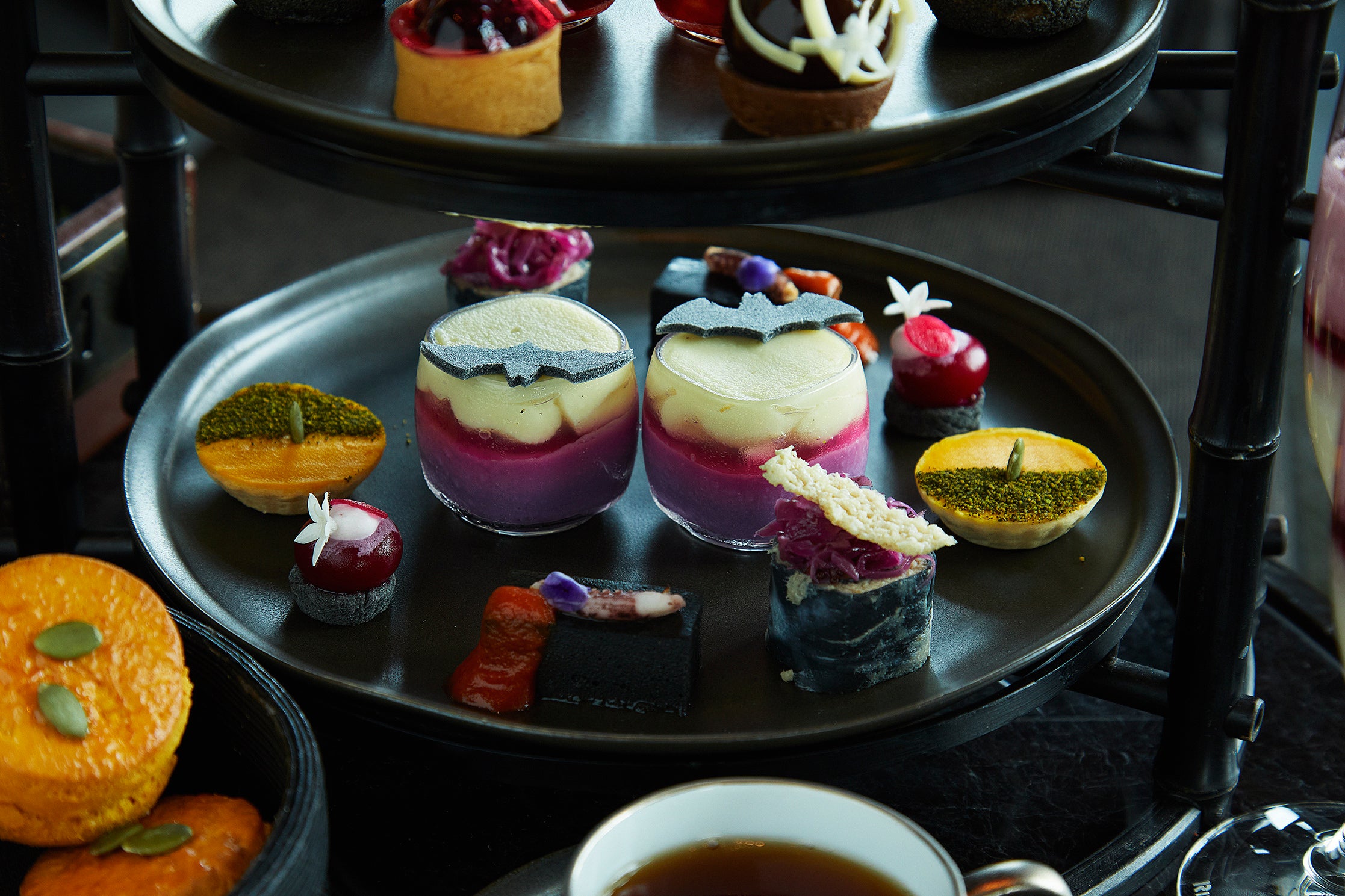 下段には、シェフがこだわって作り上げる繊細な味わいのセイボリーをご用意しました。コウモリが薄紫色のグラデーションに染まった夜空を飛んでいるかのようなデザインの、シェーブルチーズと白ワインビネガーソースを使った2色のさつま芋ムースを中心に、ポークリエットとザワークラウトを添えた竹炭クレープや、真っ赤なトマトソースがアクセントになったイカ墨のスパニッシュオムレツなど、ユニークで遊び心に満ちたセイボリーの数々をご堪能ください。