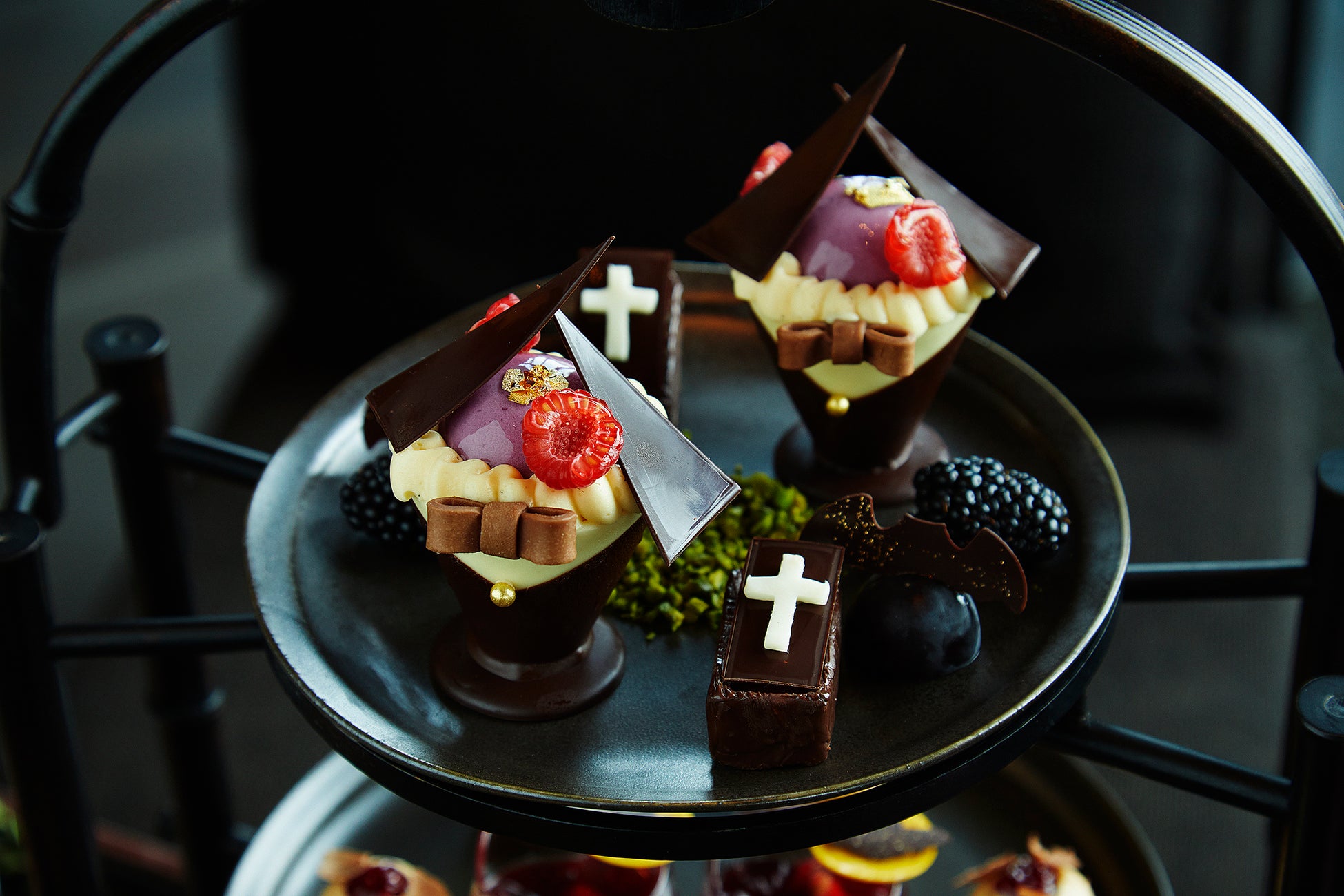 黒竹スタンドの上段では、ドラキュラに見立てたバニラと紫芋のムースがセンターを彩ります。ドラキュラが、その周りを飾るコウモリのチョコレートやコフィン(棺)をかたどったタルトなどを従えて、まるでハロウィンパレードの指揮をとっているかのようなユーモアあふれるデザインになっています。コフィンの蓋を開けると滴り出てくる色鮮やかなラズベリーソースをドラキュラのムースにかけながら、その豊かな味わいの変化をお楽しみいただけることでしょう。